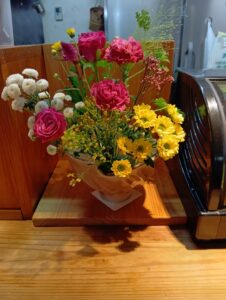 夏の間切り花を活けてもあの暑さですぐにだめになってしまったのでずっと鉢植えを置いていましたが随分と涼しくなってきたので愚母が花を活けました。